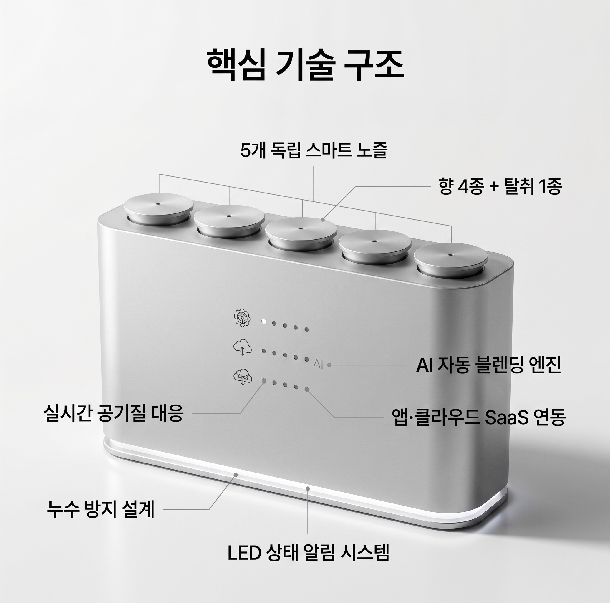 단순한 방향제가 아닙니다. 앱과 AI가 연결되어 공간의 공기를 실시간으로 감지하고 최적의 향기를 자동으로 블렌딩하는 스마트 플랫폼입니다.